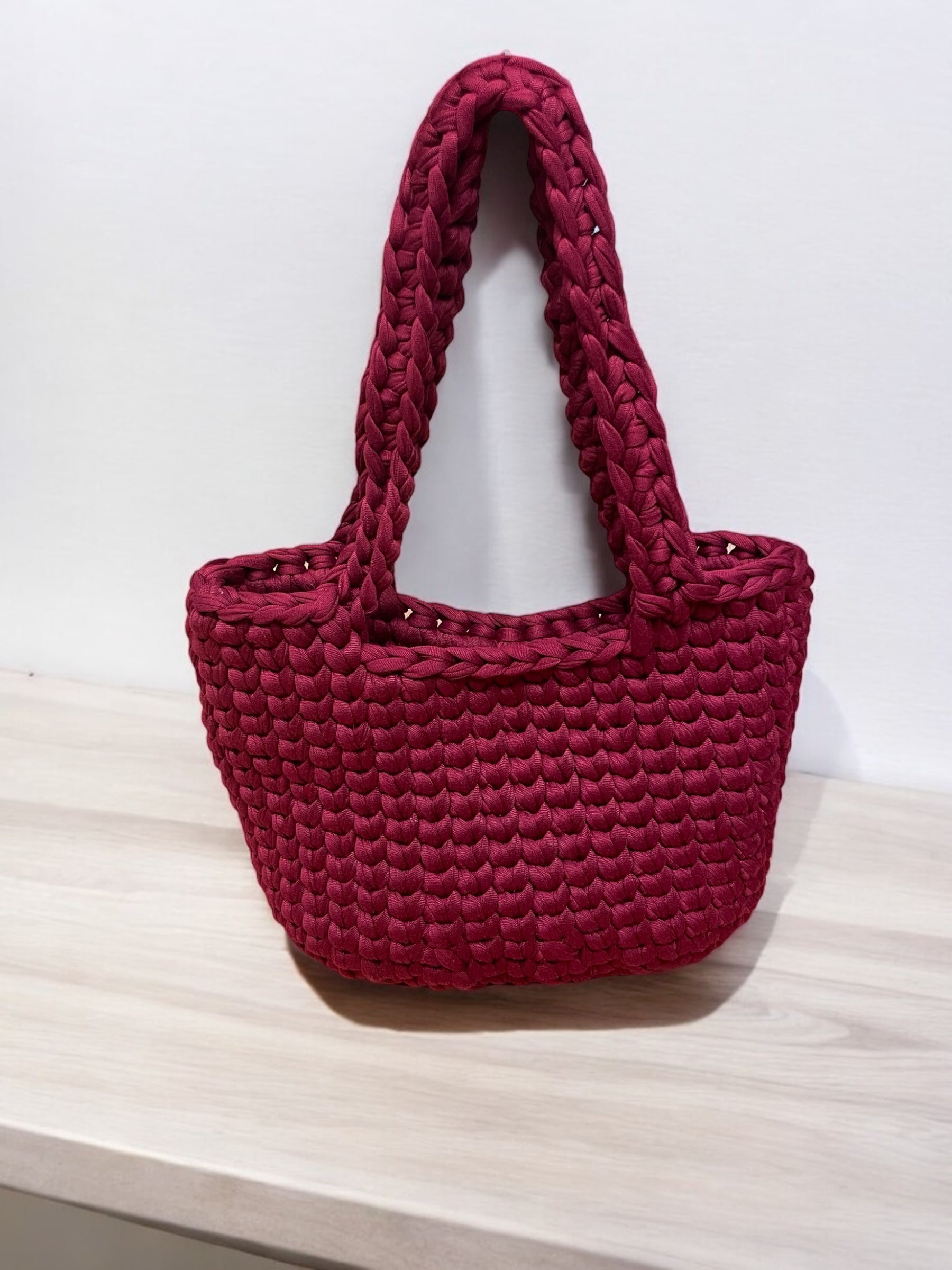 Gehäkelte Tasche aus Textilwolle, sehr fein aber doch stabil. Mit magnetischem Druckknopfverschluss und festem Boden aus Kunstleder.